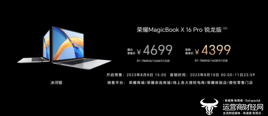 荣耀MagicBook X 16 Pro锐龙版R7-7840HS,16+512GB版售价4699元,首销专享价4399元。