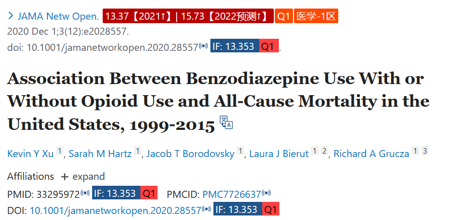 2020年9月1日,一篇题为《1999-2015年美国使用或不使用阿片类药物的苯二氮卓类药物与全因死亡率的关联》的研究论文发表在JAMA NetOpen上(IF=13.37)。