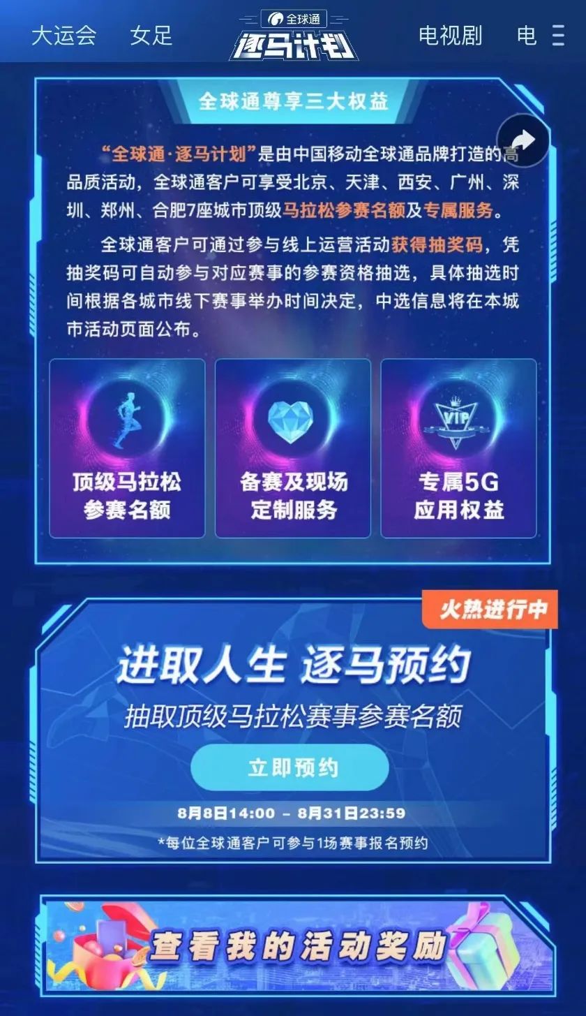 据了解,全球通的客户可以通过中国移动APP的逐马计划专区、咪咕视频APP等渠道预约报名。8月8日至8月31日,全球通客户可选择一个城市,通过参与“逐马预约”获得相应比赛名额的抽奖码。8月16日-8月31日,邀请“全球通梦想跑者”进行评选。通过创作和上传符合主题要求的视频/图片,全球通客户可以为每个城市赛道的前5名用户投票,获得相应赛事的参赛资格。