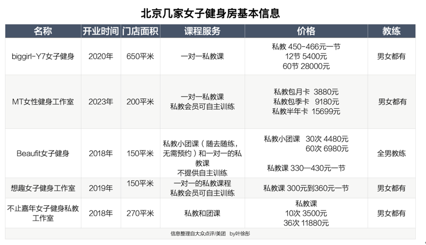 目前,一二线城市的多数女子健身房都是私教工作室,只提供一对一的私教服务或一对多的私教小团课,不提供自主训练,以私教次卡、私教包月、私教包季等短期付费模式为主。以北京的女性健身房为例,一节一小时的私教课均价普遍在300元到550元之间,消费者办卡花钱的最低门槛至少在3500元以上。