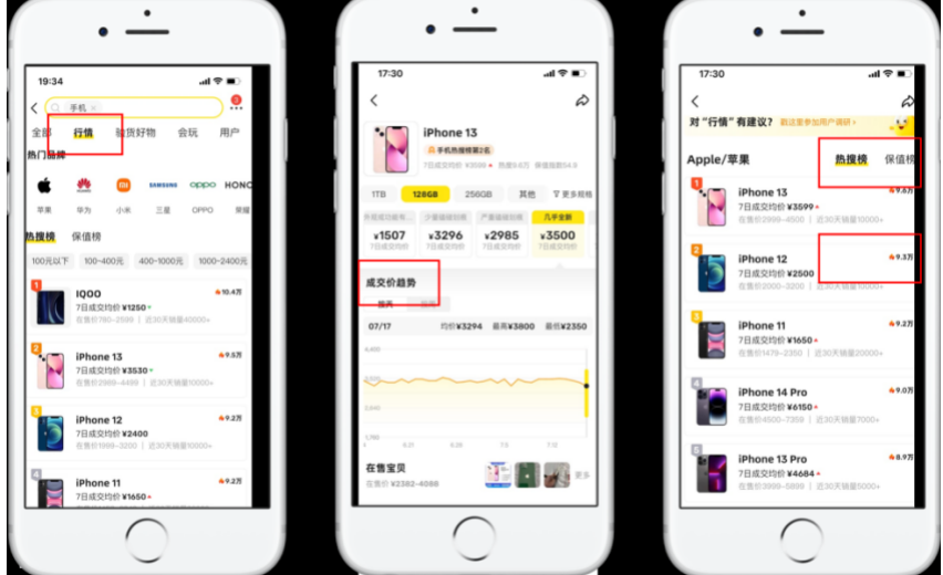 其中,“热搜榜”根据商品在闲鱼的受欢迎程度进行排名,重点关注商品7日成交均价和30日内的销量;“价值清单”呈现的是商品的价值指数,指数越高意味着价值越高。