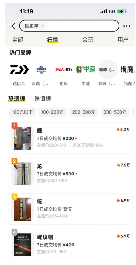 面对“垂钓者”的年轻化大军,闲鱼上涌现出许多适合入坑、适合学生党、适合初学者的钓竿,大多价格在100元左右。根据闲鱼市场热搜榜,目前终葵的鲤鱼钓竿最火,7日成交均价在220元左右,呈上涨趋势。