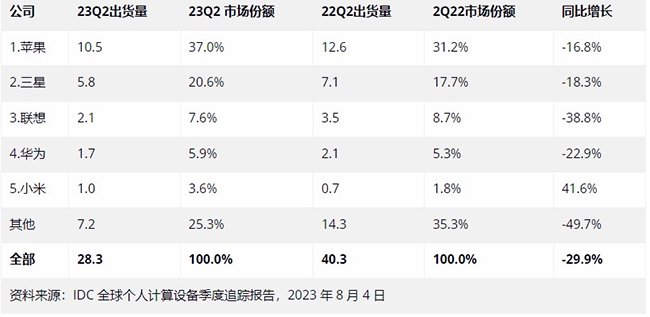 近两年,由于家庭学习和家庭办公需求的增长,苹果电脑的出货量也持续大幅增长。到了2023年,全球平板电脑市场逐渐趋于平静。IDC最新调查显示,今年第二季度全球平板电脑出货量为2830万台,同比下降29.9%。