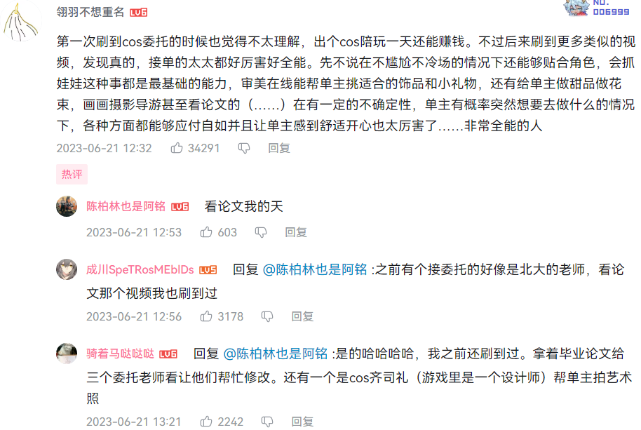 其中播放量最高的视频只有127秒,却收获了340多万次播放和33.2万个赞。不少网友在评论区表达了对cos委托的质疑,也有网友给出了“小时候有就该委托一个哆啦a梦”“委托老师的能力越来越卷了”等各种各样的评论...
