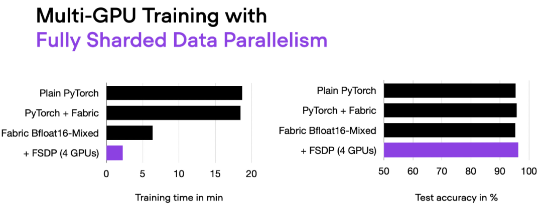 通过混合精度训练,我们将训练时间从 18 分钟左右缩短到 6 分钟,同时保持相同的预测性能。这种训练时间的缩短只需在实例化 Fabric 对象时添加参数「precision="bf16-mixed"」即可实现。