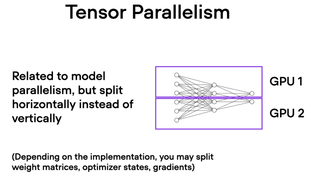 与数据并行不同,张量并行将模型本身划分到多个 GPU 上。并且在数据并行中,每个 GPU 都需要适 应整个模型,这在训练较大的模型时可能成为一个限制。而张量并行允许训练那些对单个 GPU 而言可能过大的模型,通过将模型分解并分布到多个设备上进行训练。