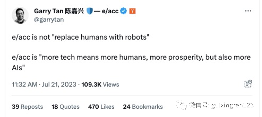 Garry Tan写道,“e/acc并不意味着用机器人取代人类。e/acc意味着更多的科技会带来更多人性化的东西,更多的繁荣,更多的人工智能。”