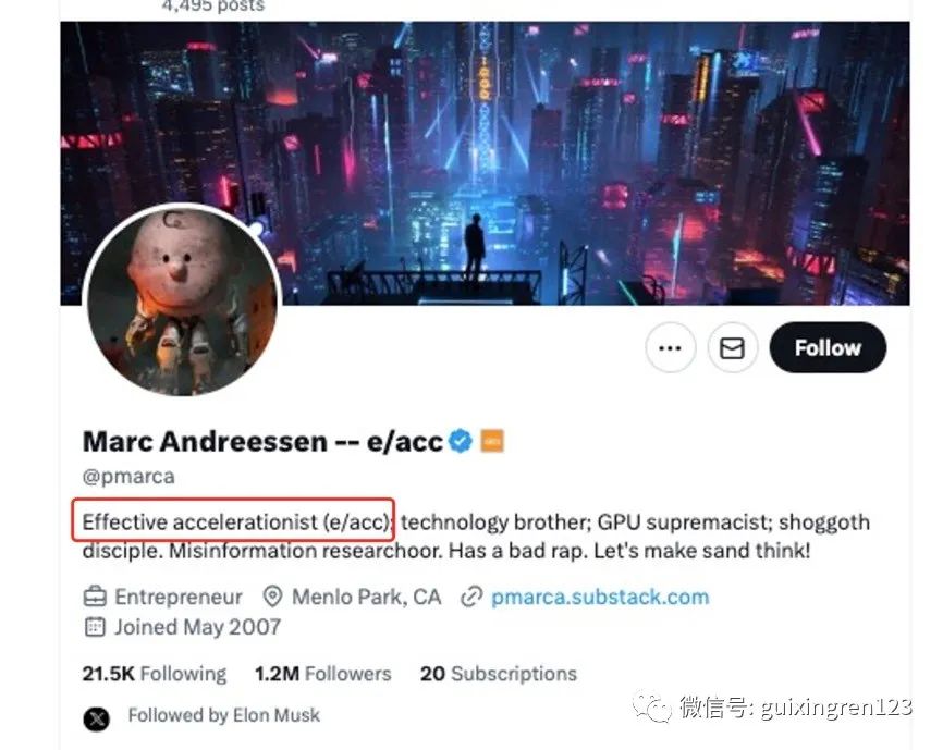 在人工智能威胁论被大量讨论的当下,“e/acc”推动人工智能技术发展的坚定立场和社会想象力也得到了大批大佬的响应。例如,硅谷著名风险投资家A16Z的创始人马克·安德森在Twitter主页上的第一篇文章就明确表示他是一个“有效的加速支持者”。