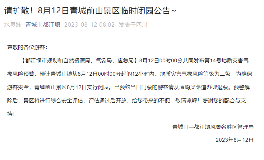 据青城山都江堰官方微信消息,都江堰市规划和自然资源局、气象局、应急局于8月12日00时联合发布第14号地质灾害气象风险预警。预计8月12日00时起12小时内,青城山镇地质灾害气象风险等级为二级。为确保游客安全,青城千山景区于8月12日关闭。已预订当天门票的游客,应从原购买渠道申请退票。预警解除后,景区将进行全面安全评估,评估通过后开放。请原谅给您带来的不便!感谢您的合作和支持!