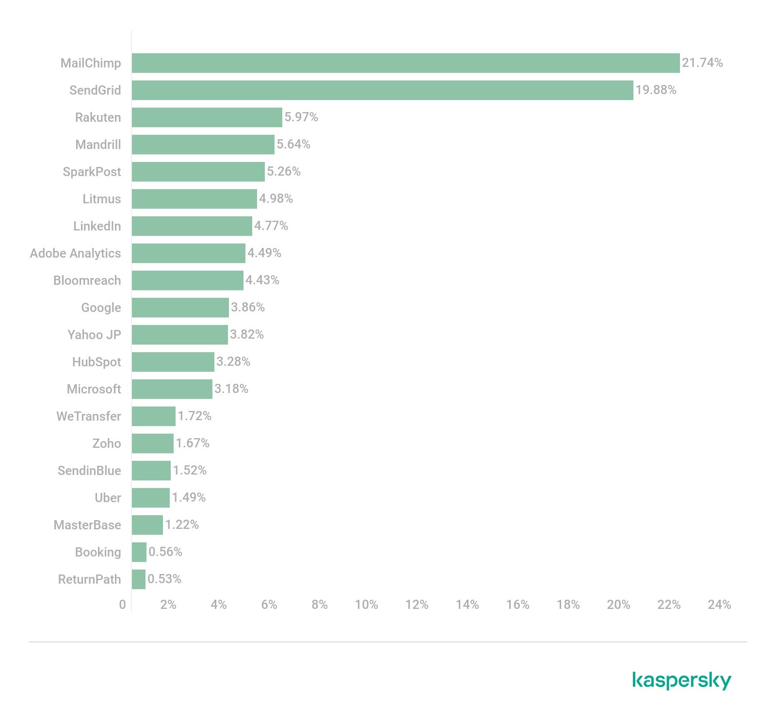 邮件信标的数据来自卡巴斯基邮件产品的匿名反垃圾邮件检测数据。名单上的公司要么是电子邮件服务提供商(ESP),要么是客户关系管理(CRM)公司。