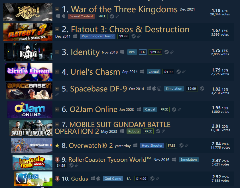 在队员们十几个小时的努力下。OW2成功进入Steam历史差评榜前十,这款曾经获得TGA年度游戏的续作被送上了“耻辱堂”。
