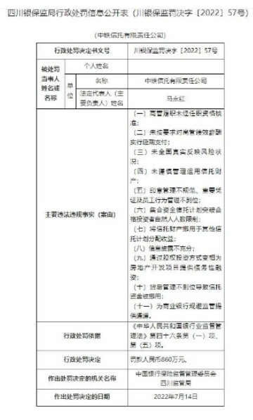 值得一提的是,根据川监处罚决定书[2022]57号,中铁信托存在11项违法事实,中国银行保险监督管理委员会四川监管局对中铁信托有限公司罚款人民币860万元。
