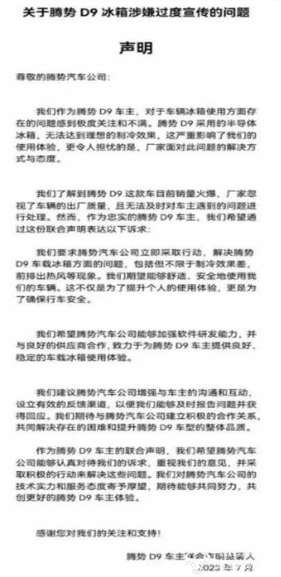 运营商财经网注意到,今年7月,有部分腾势D9车主联名发起声明,称腾势D9冰箱涉嫌过度促销。具体问题有:腾势D9使用的半导体冰箱无法获得理想的制冷效果,冰箱工作时前排容易喷热风,散热口不合理。