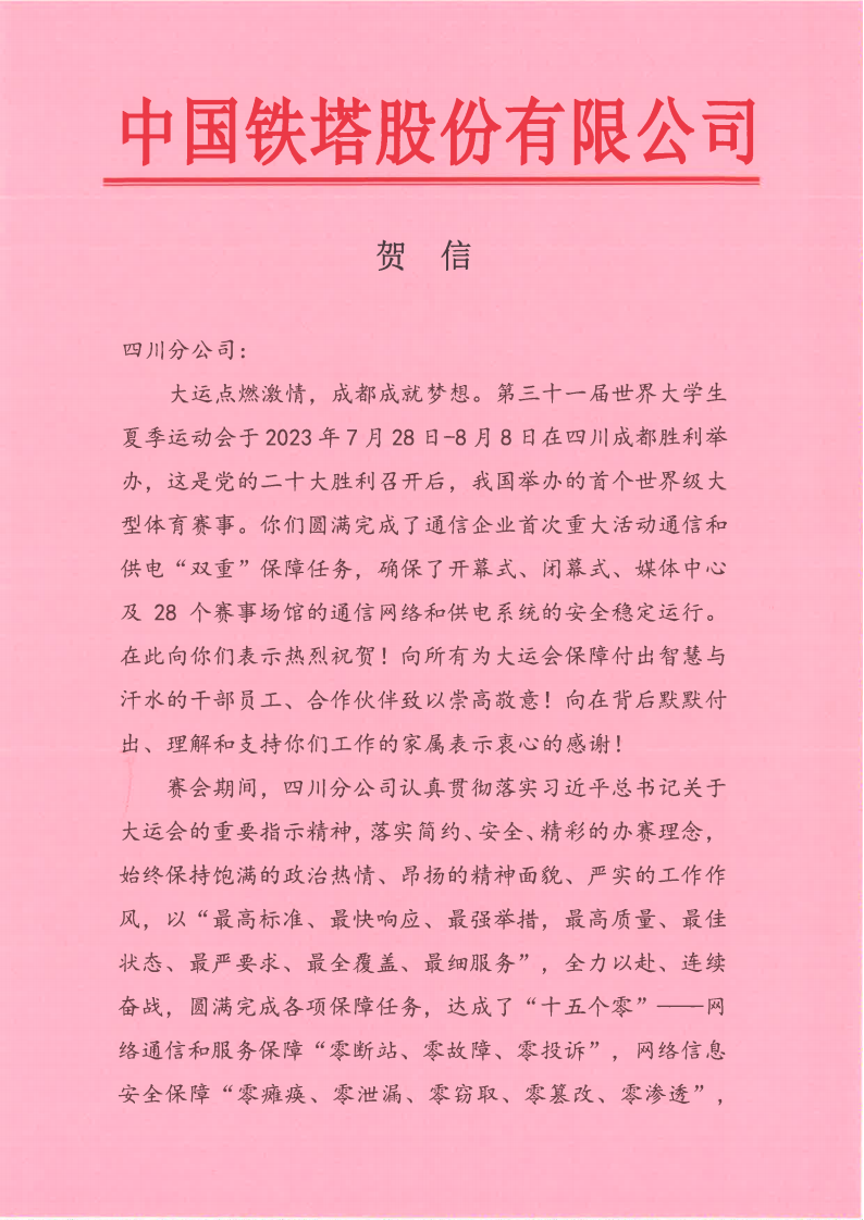 中国铁塔将大运会相关保障服务作为一项重大政治任务,强化使命。成立了由公司主要领导组成的大运会通信和供电保障领导小组。领导小组组长、党委书记、董事长,副组长、党委副书记、总经理顾,保障办公室主任、副总经理多次到四川省分行,深入调研慰问,指导大运会再保险工作。