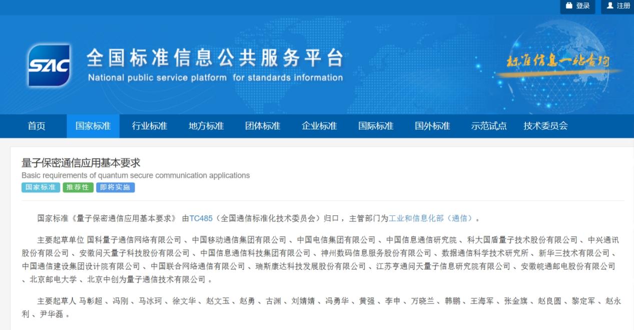 我国标准主要分为国家标准、行业标准、地方标准和企业标准四个层次,其中国家标准是最高层次,是四级标准体系的主体。此次发布的国家标准《量子保密通信应用的基本要求》规定了量子保密通信应用的基本要求及其与现有ICT应用的集成方案,有望进一步推动量子密钥分发(QKD)技术与现有应用技术的结合,为QKD系统便捷地集成到现有ICT基础设施中进行应用提供参考。郭克量子通信网络有限公司、中国移动通信集团有限公司、中国电信集团有限公司、中国信息通信研究院、科达国盾量子技术有限公司参与了本标准的制定。