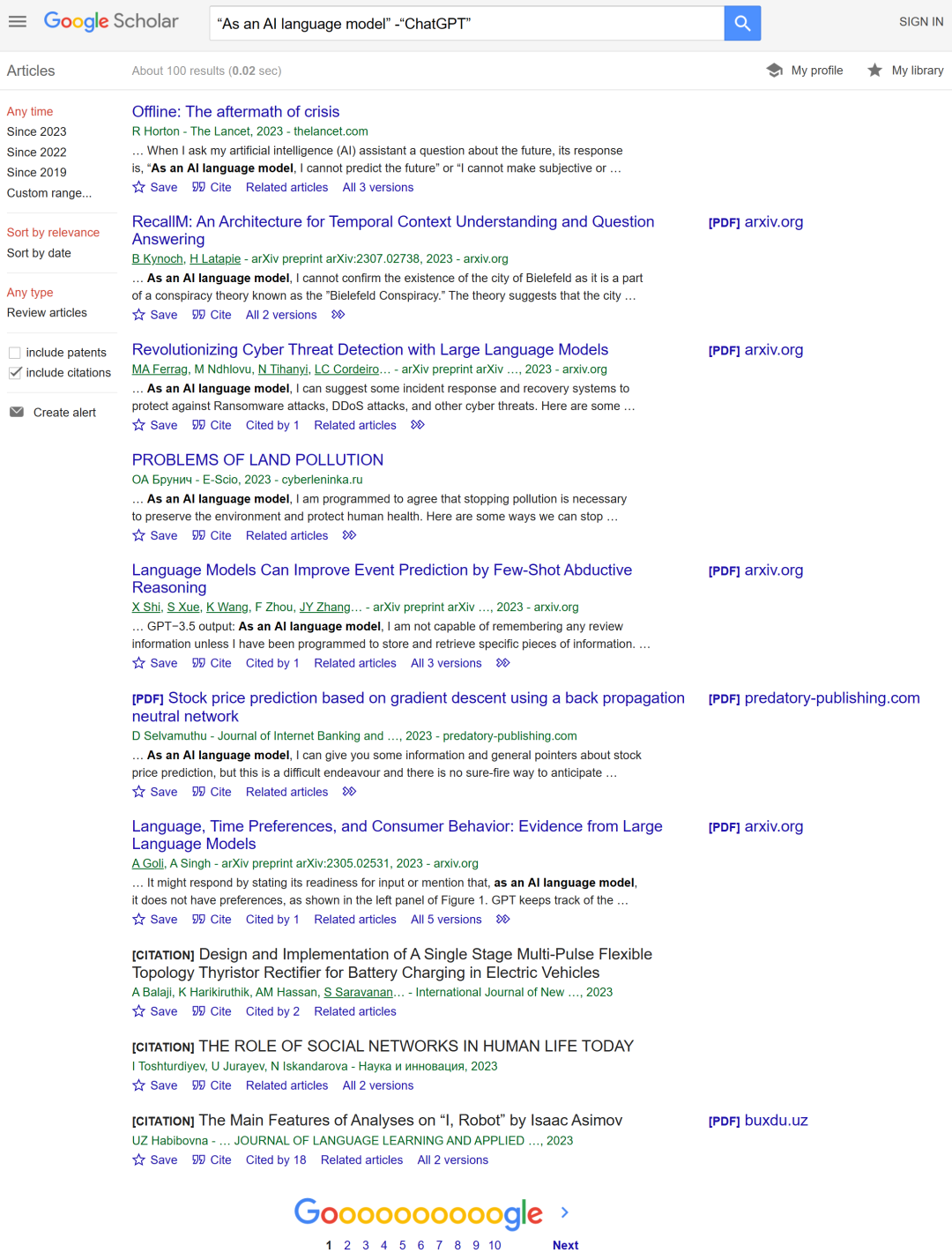 机器心也在Google Academic中输入“作为AI语言模型”——“chat GPT”,出现了10页,大约有100篇文章。