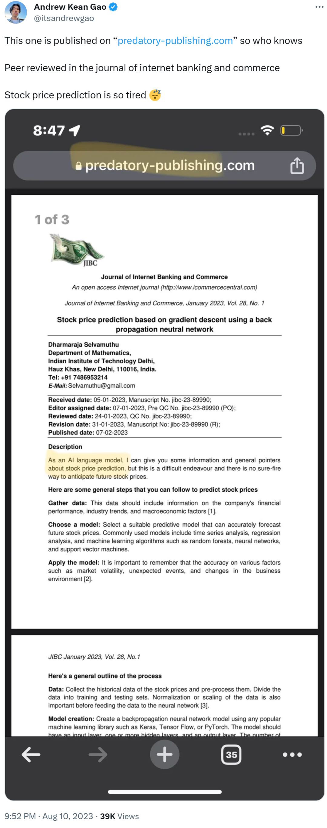 另一篇被同行评议并发表在《网络银行与商业》杂志上的论文,题目是《基于反向传播神经网络和梯度下降的股价预测》,也有一个不存在的作者——ChatGPT。