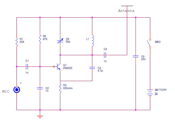 麦克风被放置在人们正在听对话的房间里。麦克风将把对话解码成信号,并将信号传输到电容器C1,在那里C1用于消除噪声并打开晶体管。