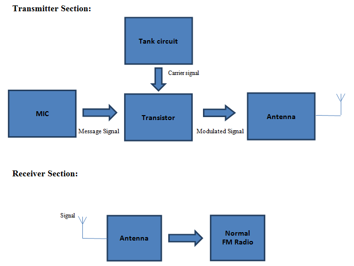 从框图中我们很容易理解,信息信号或对话信号是由槽电路产生的载波频率调制的。信息信号和载波信号经晶体管调制后,调制信号通过天线发射到空中。接收天线接收调制后的信号,并将其传输到调频收音机,用户可以在此收听对话。用户应调整收音机的接收器频率,以接收来自发射器的信号。