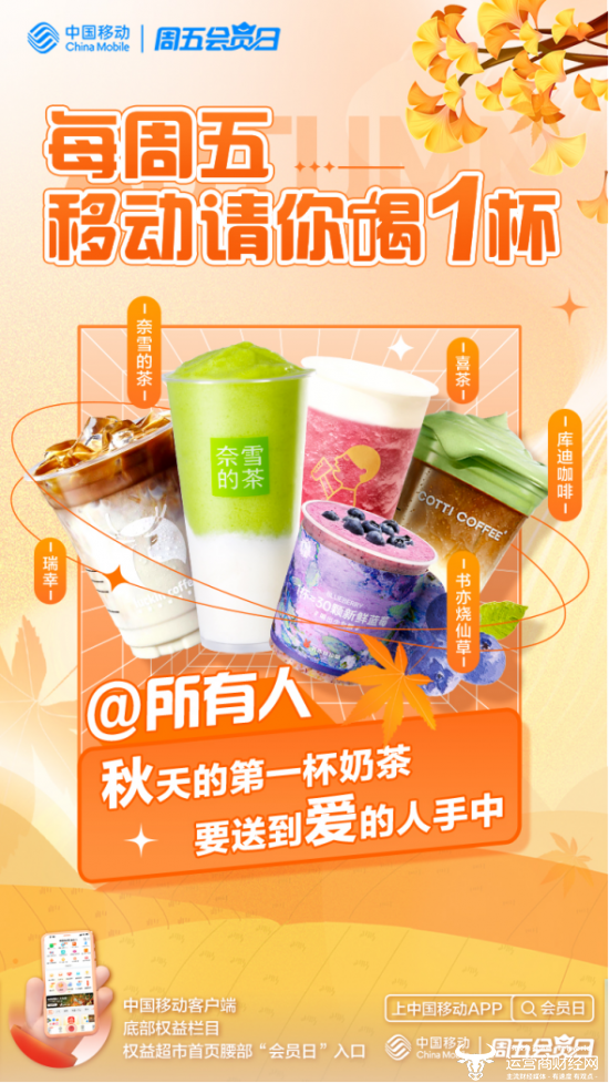 随着中国移动“每周五,移动请你喝一杯”活动与“秋季第一杯奶茶”的精彩碰撞,势必给消费者带来一场秋季奶茶狂欢的开始!接下来,中国移动权益超市将继续为客户带来更多“接地气”的权益产品,全方位覆盖客户生活场景,通过更优质的产品、更贴心的会员权益、更便捷的消费环节、更精准的服务场景,为客户打造数字生活消费的全体验!