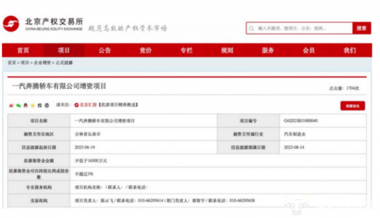 此外,北京产权交易所还披露了一汽奔腾轿车有限公司增资项目..据悉,一汽奔腾拟通过增资方式引入外部投资者,拟募集资金金额不低于1.65亿元;此外,一汽奔腾原股东中国一汽拟以非公开方式增资约40亿元。