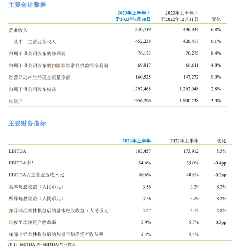 归属于母公司股东的净利润762亿元,同比增长8.4%,每股收益3.56元。盈利能力继续保持国际一流运营商的领先水平。EBITDA为人民币1835亿元,同比增长5.5%,EBITDA占主营业务收入的40.6%。资本支出为人民币814亿元,自由现金流为人民币791亿元,同比增长43.3%。