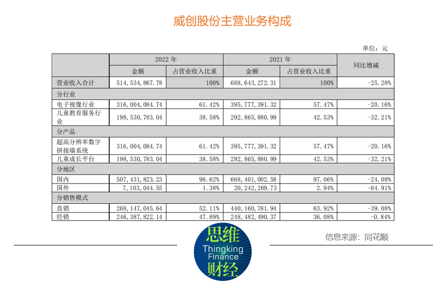 目前,威创的主营业务为超高分辨率数字拼接墙系统业务(VW业务)和儿童成长平台业务。2022年电子视像行业收入占比61.42%(见下表)。