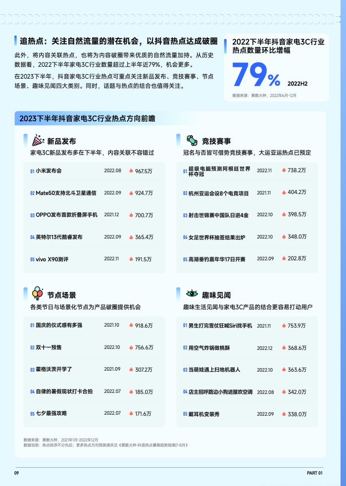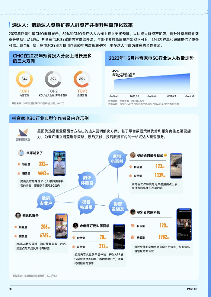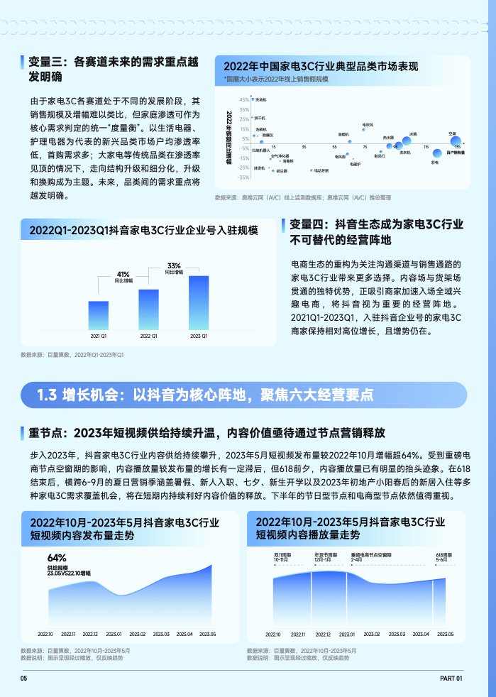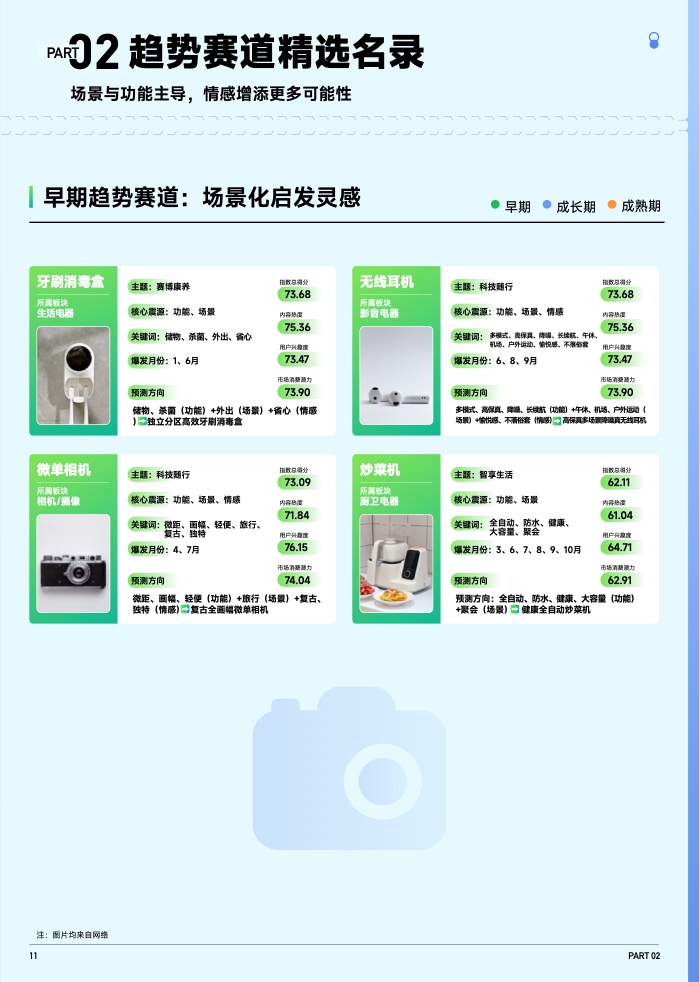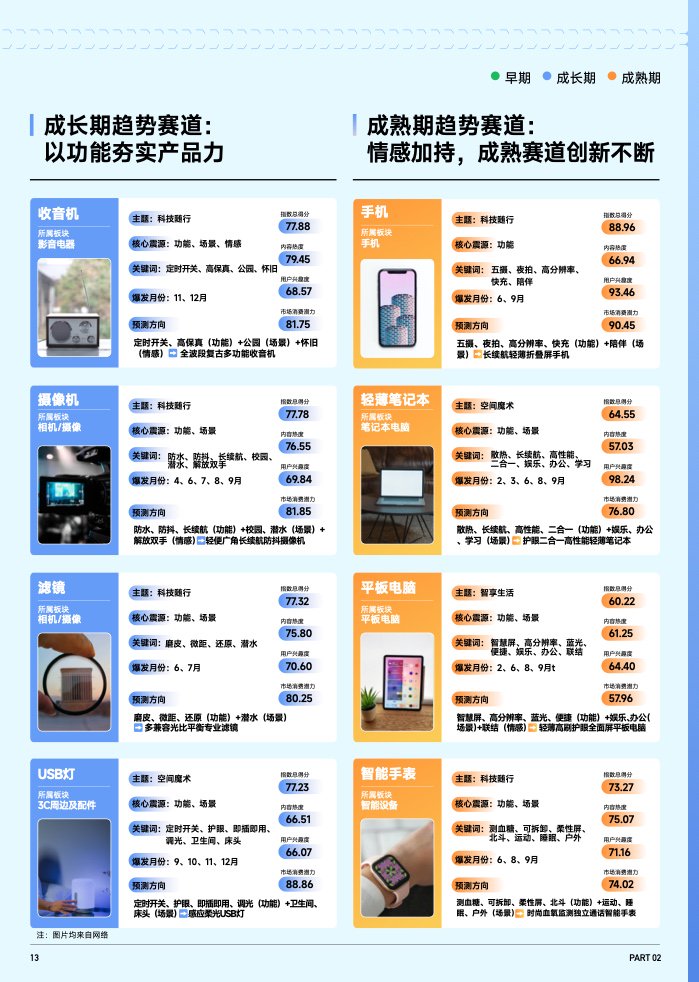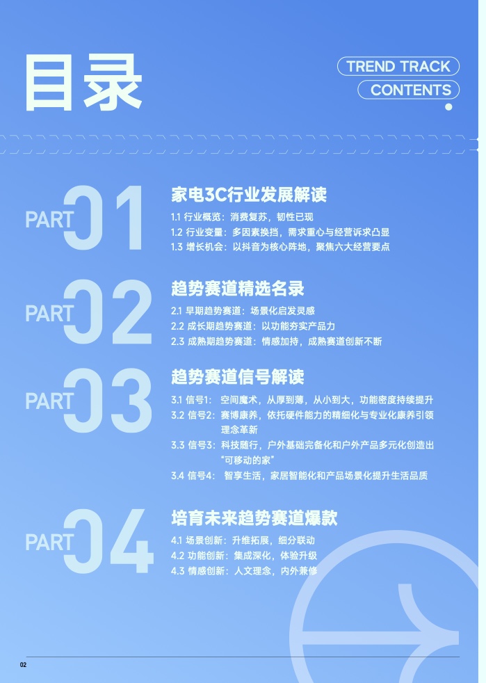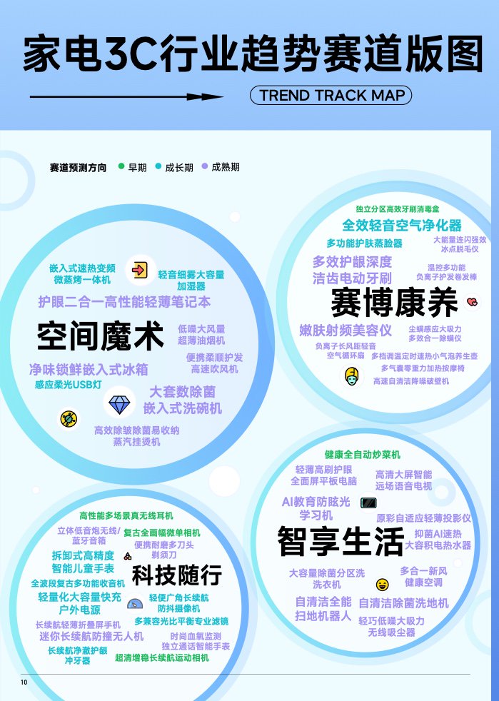 报告显示,在抖音平台上,我们可以看到家电3C行业的定位非常重要,高潜力赛道的选择将决定品牌的发展方向。报告提供了早期、成长期和成熟趋势轨迹的精选列表,每个阶段都有不同的创新方向和市场机会。其中,通过平台作为核心阵地,品牌可以聚焦六大业务点实现增长。