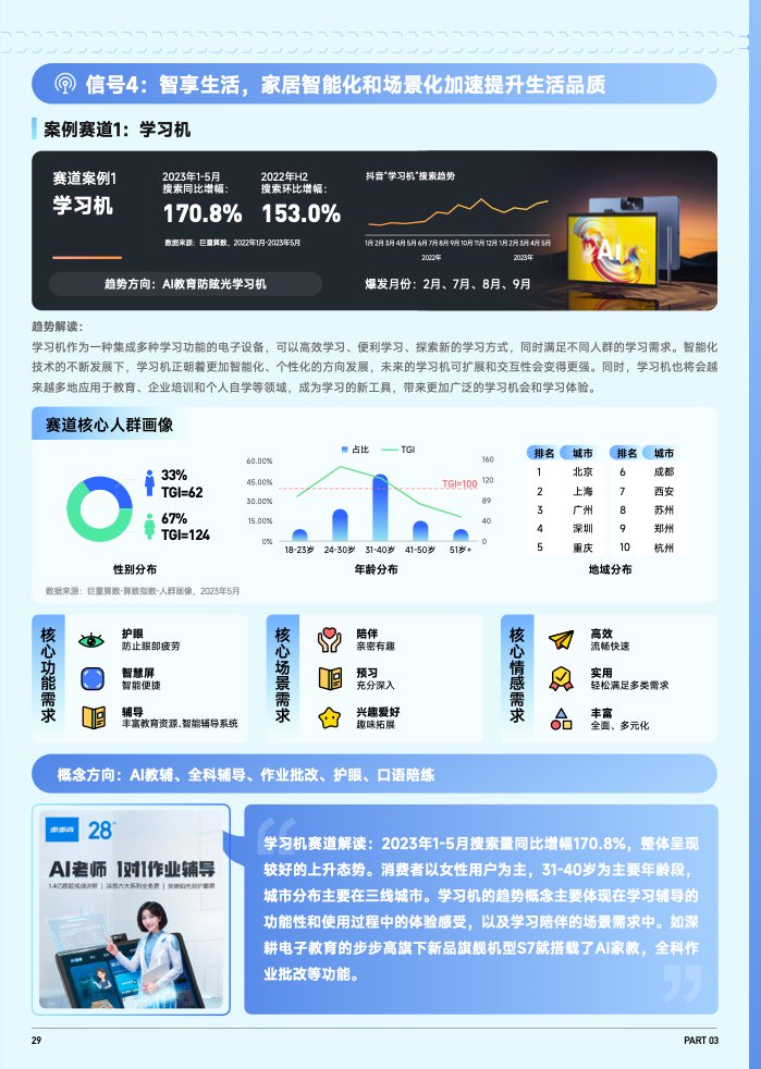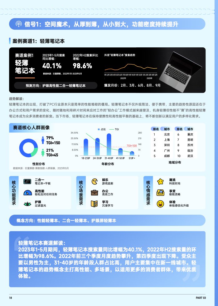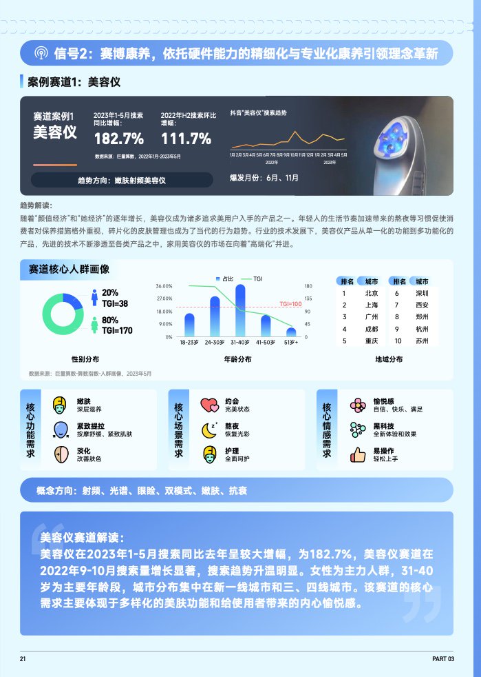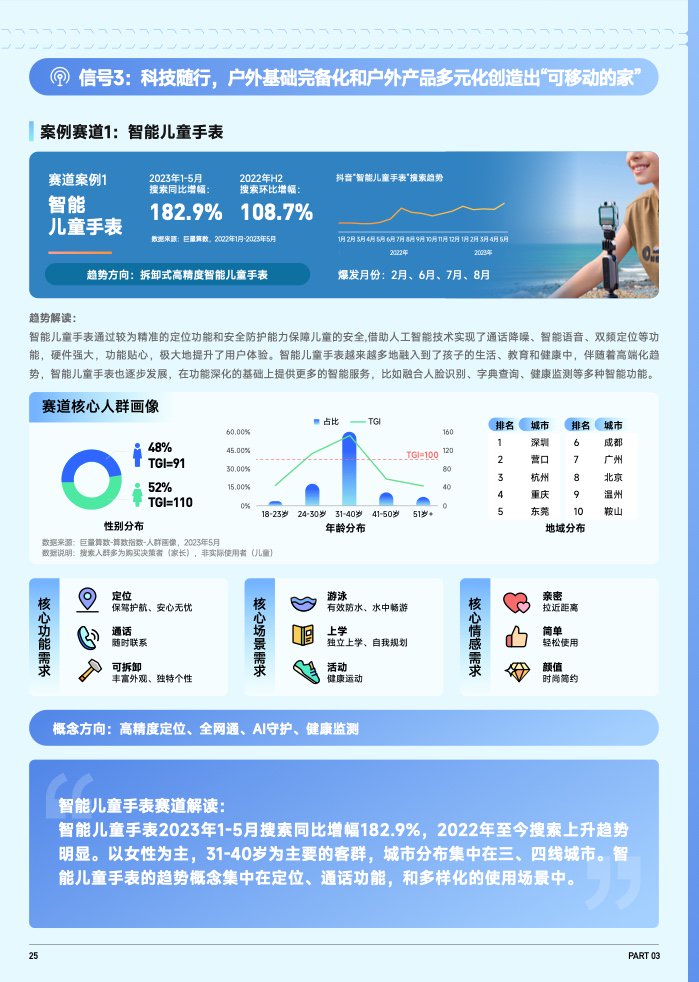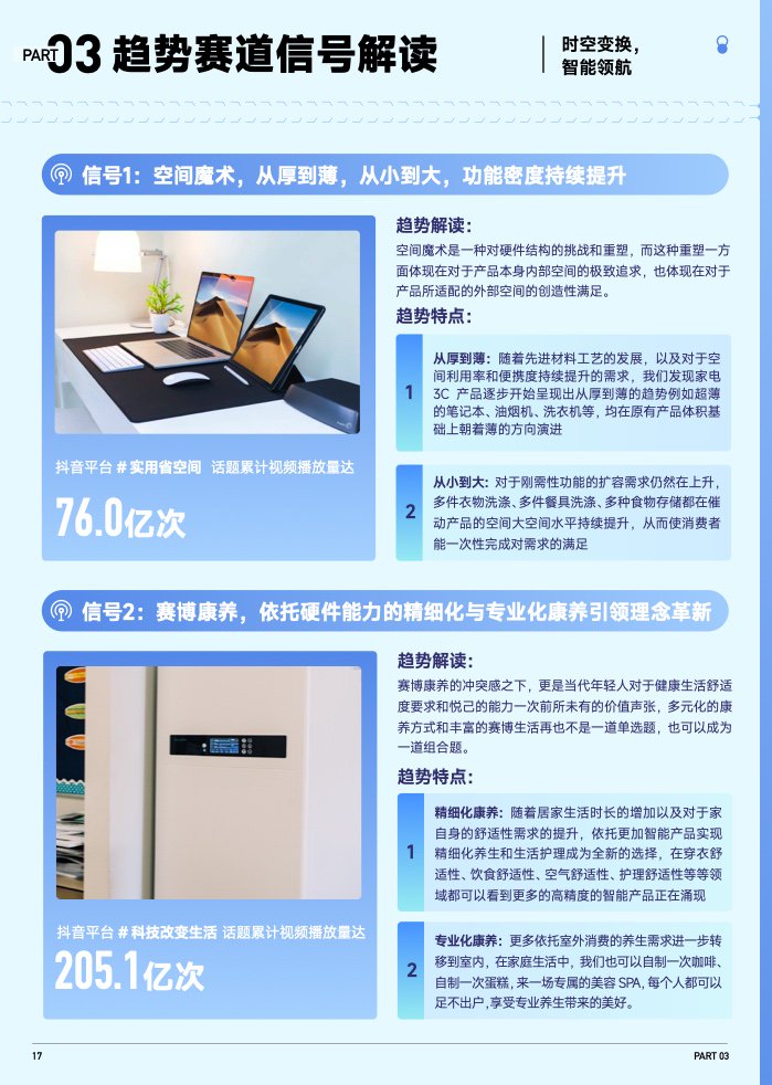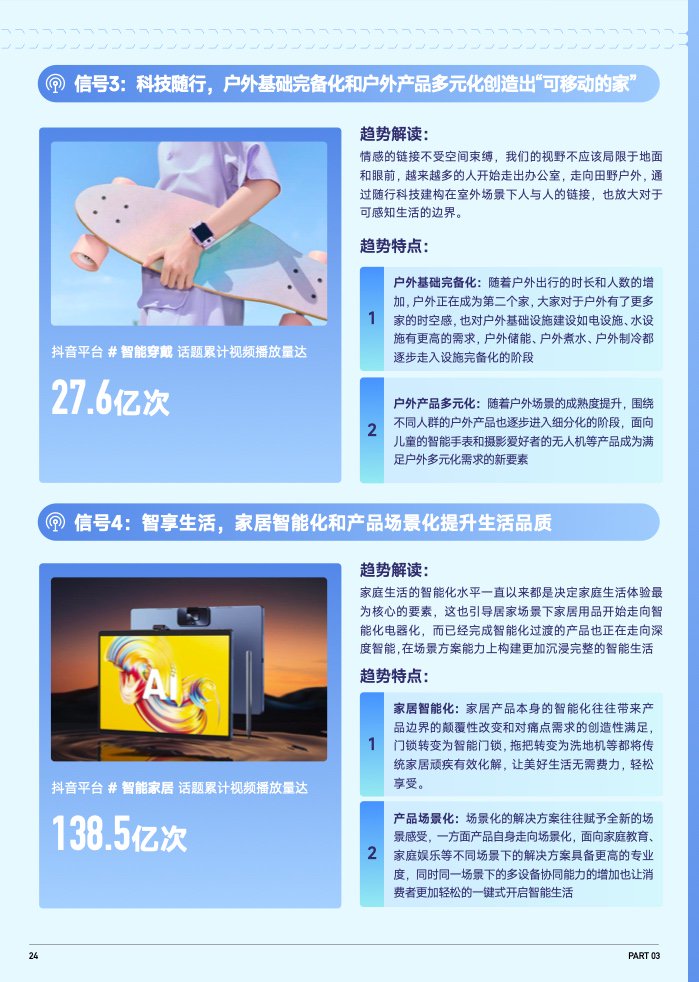 报告还深度解读了趋势轨迹的信号。首先是空间魔法。产品由粗到细,由小到大,功能密度不断提升。其次,赛博健康医疗,依托硬件能力,实现精细化、专业化的健康医疗指导。第三个信号是,随着科技的发展,户外基础设施的完善,户外产品的多样化,造就了移动之家。最后一个信号是智能享受生活,通过家居智能化和产品场景提升生活品质。