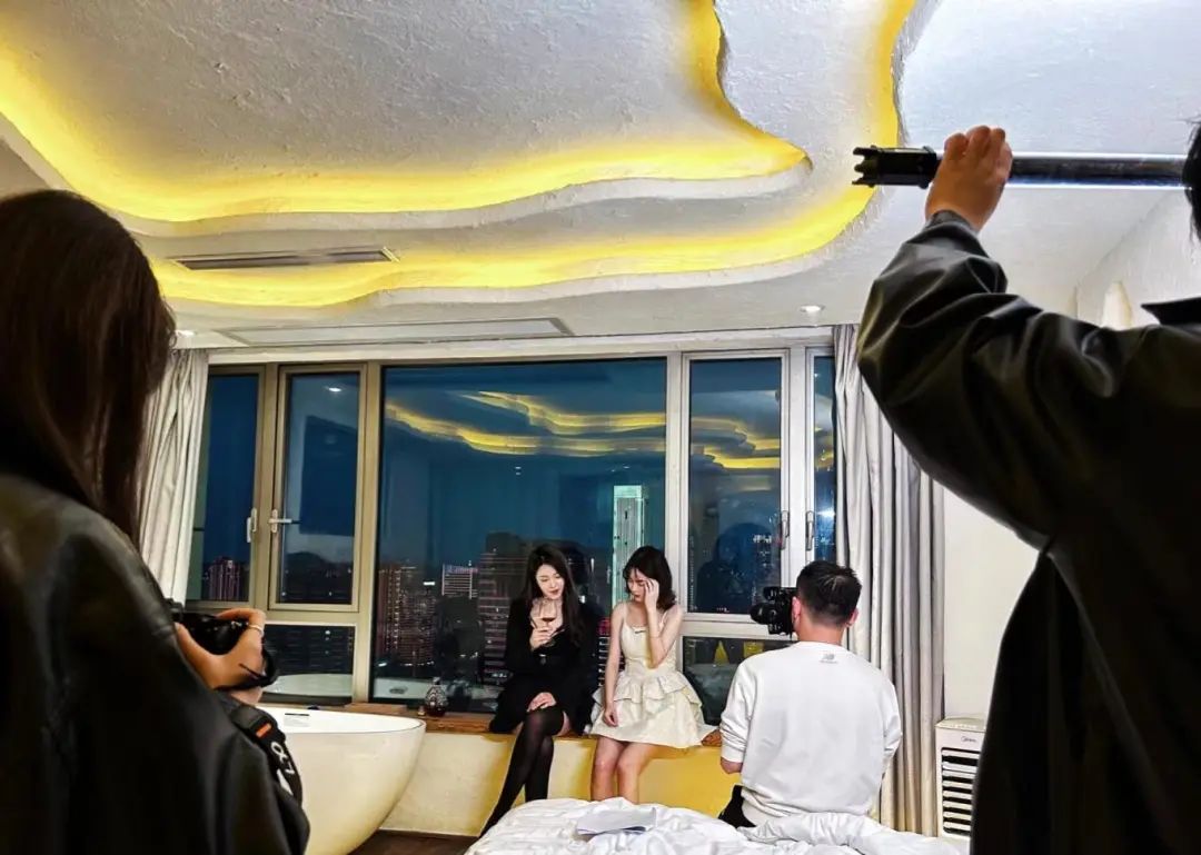 不少短剧公司都有合作的承制方或者自己的剧组。这些剧组大多分布在横店、长沙、成都和长春等非一线城市。除了群演,一个剧组的成员可能不超过 20 个,不少还要身兼数职,制片同时是导演、监制和后期是常事,还发展出了一套成熟的流水化拍摄流程,拍摄一部 100 集的短剧不超过 7 天,最快只要 3—4 天。