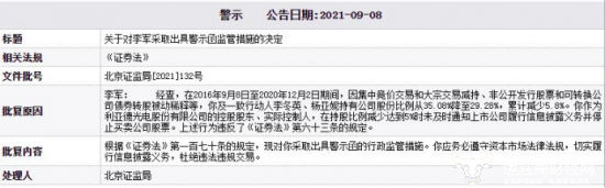 值得注意的是,2021年,李俊收到了北京证监局的监管函。根据利亚德2021年9月8日公告,2016年9月8日至2020年12月2日期间,因集中竞价交易及大宗交易减持、非公开发行股票、可转换公司债券被动稀释等原因,及一致行动人李冬英、杨持股比例由35.08%下降。当李俊持股比例降至5%时,未及时通知上市公司履行信息披露义务,停止买卖公司股票。上述行为违反了《证券法》第六十三条的规定。