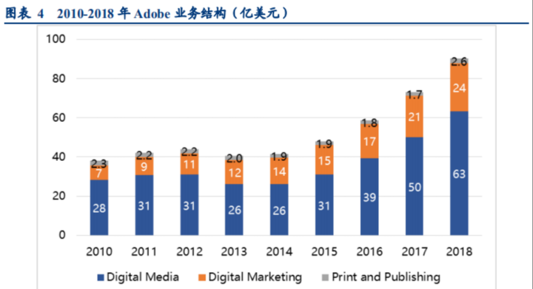 从2016年起,Adobe的收入接连创造历史新高。2016年,总收入58.5亿美元,2017年超过70亿美元,2018年达到90.3亿美元。在这个阶段,Adobe收入增长的主力,一直是数字媒体业务,它从2015年的31亿美元,增长到了2018年的63亿美元。