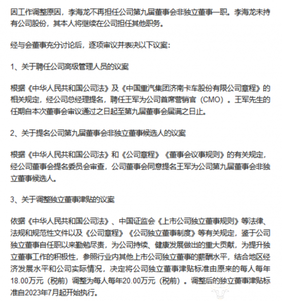 根据中国重汽官方公告,今年6月,经总经理赵提名,王军被任命为公司首席营销官。通过王军之前的工作经历可以看出,他在销售方面积累了足够的工作经验,负责营销业务也就顺理成章了。