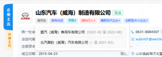 据天眼查APP显示,山东汽车(威海)制造有限公司曾使用中国重汽(威海)商用车有限公司名称,中国重汽(威海)商用车有限公司名称使用时间为2021年2月至2022年8月。