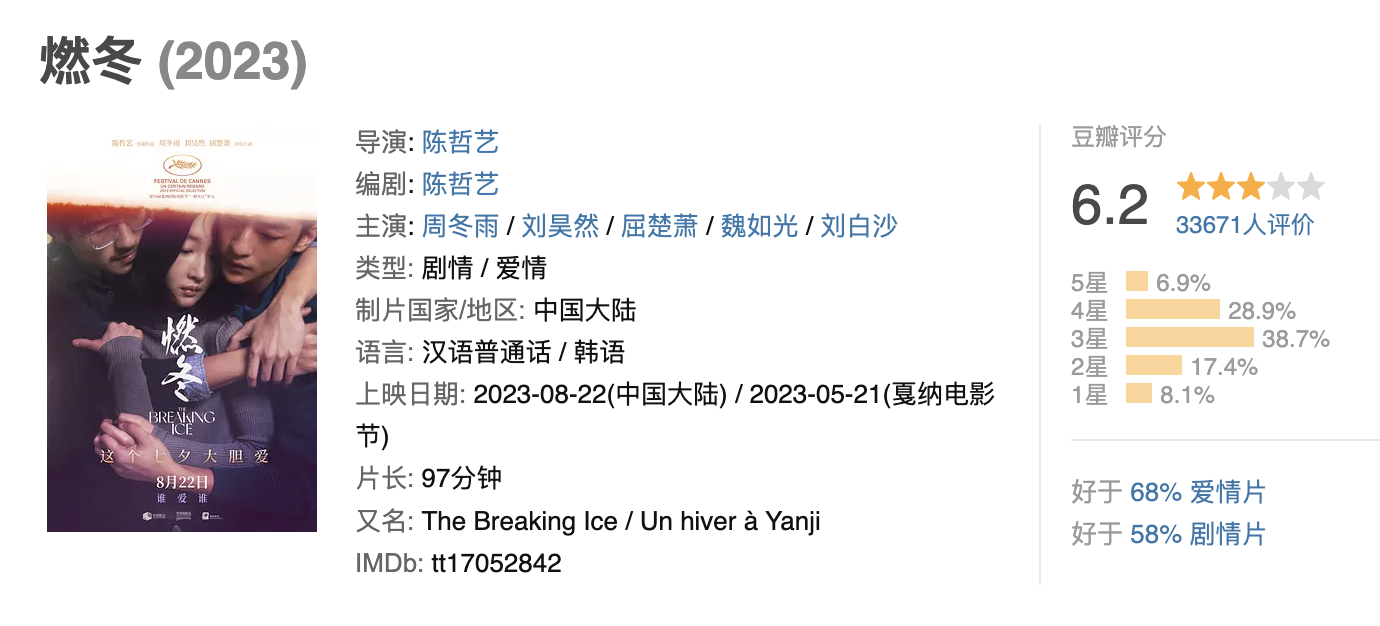 陈哲艺导演,周冬雨、刘昊然、屈楚萧主演的《燃冬》,本是文艺片,却要走商业片的宣发模式,档期定在“七夕”也就罢了,还不断在三角关系、周刘恋情、情欲尺度的话题上造势营销,甚至主动曲解人物,只为取悦市场,竭力争取票房。
