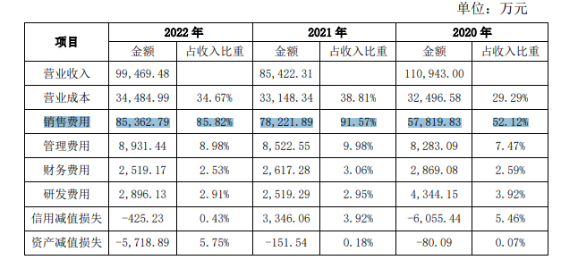 近年来,广誉远一直存在销售费用高的问题。2020年至2022年,公司销售费用分别约为5.78亿元、7.82亿元和8.54亿元,分别占总收入的52.12%、91.57%和85.82%。