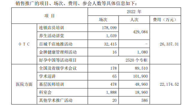 OTC主要分为连锁店店员培训、健康活动大讲堂、百城千店推广活动、金牌健康管理师活动、好孕中国等活动;医院主要分为国家级和省级学术会议、学术讲座、基层医师培训、科室会议等学术推广活动。