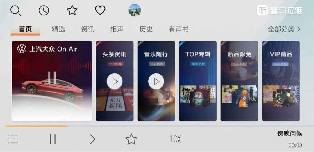 比如上汽大众的喜马拉雅定制版,推出了24小时音频音流“上汽大众On Air”,每天早、中、晚、晚、晨六个时段定制节目,可以24小时播放。为车主打造定制方案。同时,喜马拉雅与上汽大众联合推出了一系列定制节目,包括吃喝玩乐、好物分享、车主社群互动、娱乐资讯、汽车保养技巧等。大众品牌车型MOS 3.1、MOS 3.2、MOS 4.0的车主可以直接从app store下载到车载界面,为驾驶增添乐趣。