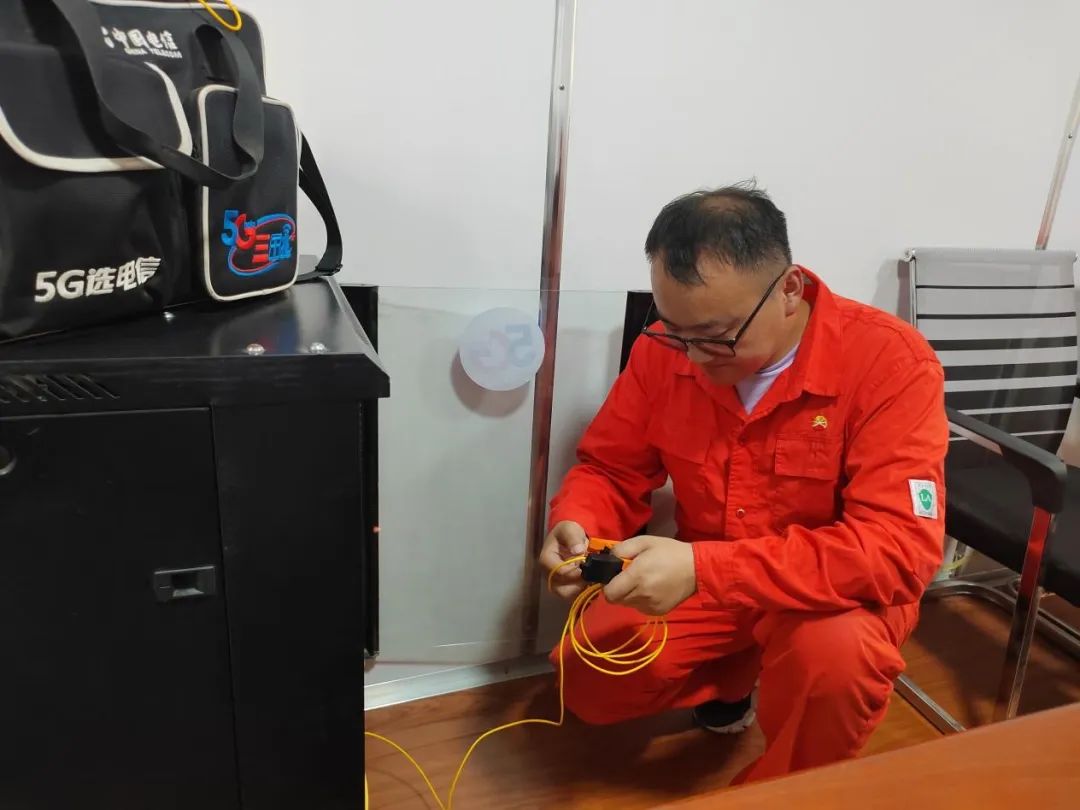 当石油工人在钻井平台上忙碌的时候,中国电信霸州分公司的曹立元拿着工具箱走进钻井队生活区的板房,打开会议室的通信机柜仔细检查。按照钻井队的要求,曹立元去工作区或生活区维修时,必须穿厚厚的防静电工作服。由于烈日炎炎,即使他开着空调工作,他仍然汗流浃背。好在设备运行正常,他也就放心了。