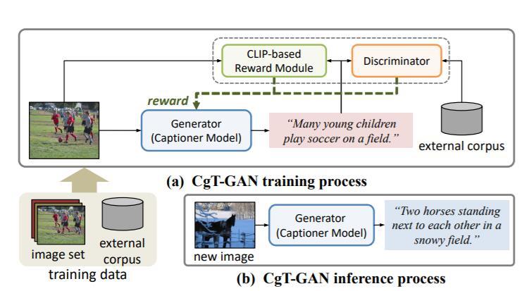CgT-GAN通过将图像纳入训练过程,使模型能够“看到”真实的视觉模式。具体来说,研究团队利用对抗训练教会CgT-GAN模型模仿外部文本语料库中的短语,同时利用基于CLIP的奖励机制提供语义指导。