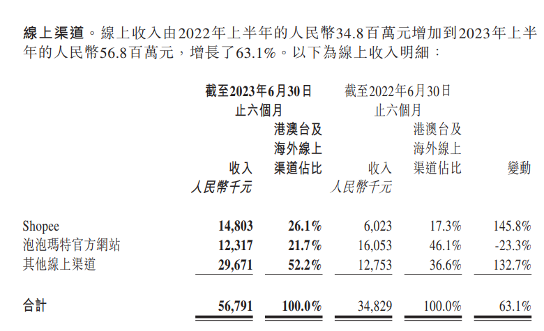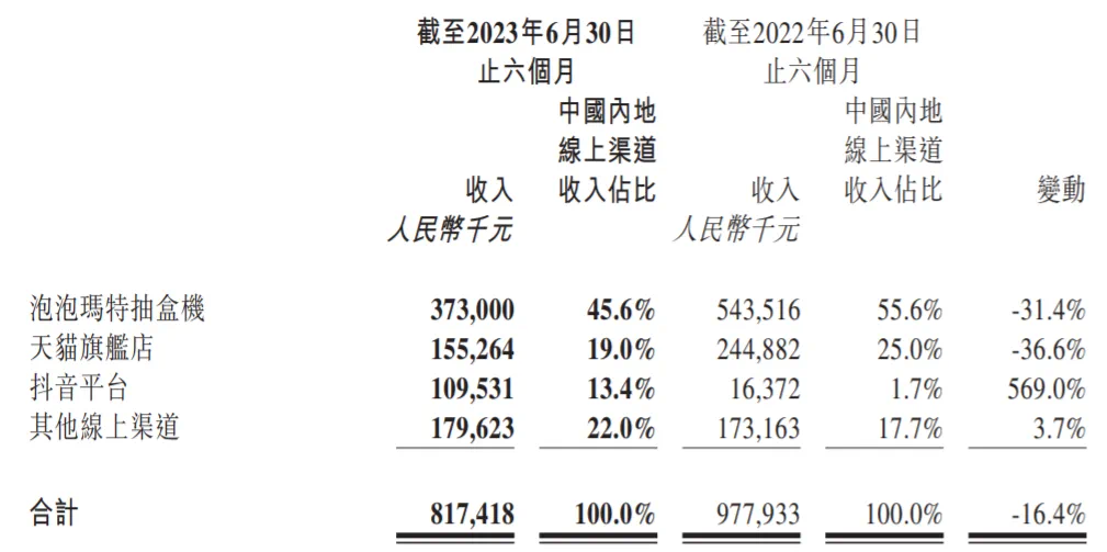 线上收入减少,线上收入从2022年上半年的9.78亿元下降到2023年上半年的8.17亿元,降幅为16.4%。