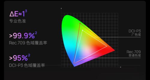 ●色域:也叫色彩范围,代表显示设备能够显示的颜色数量。高色域显示设备不仅可以带来更丰富的色彩,而且色彩过渡更加自然细腻。目前常见的色域有美国电影工业定义的DCI-P3色域和电视广播常用的Rec.709色域。色域指数通常用XX%的色域比例来表示,比例越大,色域越高。必须注意的是,XX%色域有两个值:覆盖率和面积比,覆盖率更有价值。覆盖率是对显示器可以显示的色彩范围和特定色域标准之间的重叠的度量。高覆盖率意味着显示器可以准确还原更多的颜色。所以覆盖率最高只能接近100%(比如业界公认的专业显示器AppleProDisplayXDR的DCI-P3色域覆盖率是95%),不可能超过100%。任何大于100%的值都必须是面积比。