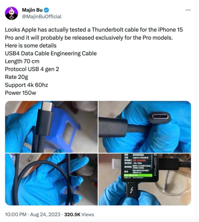 后来记者还说苹果已经测试了iPhone 15Pro系列的雷电线。数据线由之前暴露的编织材料制成,长约70cm,重约20g。采用USB 4 Gen 2协议,最高传输速率10GbpsUSB 3.2下。USB 4 Gen 2下最高可达20Gbps,支持外接4K 60Hz显示,支持150W W供电