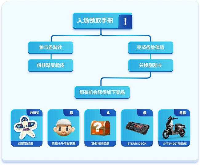 每完成一次指定的游戏体验,就会获得一枚印章。完成5次体验后,可以在兑换区换一张刮刮卡。刮刮乐奖励等级随机抽取,幸运者将获得SteamDeck大礼包!
