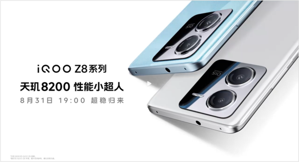 “性能超人”iQOO Z8不仅搭载了天机8200,还配备了120W超闪充,相当于5000mAh超级电池,3K VC冰极三维散热,OIS光学防抖影像模块。机身有白色和蓝色两种高颜值设计,整体相当优秀。新品发布会将于8月31日(周四)19:00正式召开,敬请期待。