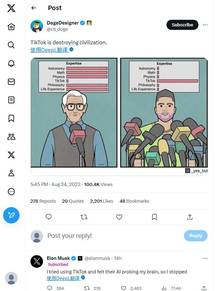 在回应他的推特时,马斯克也直言不讳地谈到了抖音:“我用过抖音,但我感觉他们的AI正在检测我的大脑,所以我仍然不需要它。”