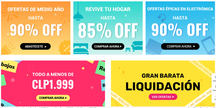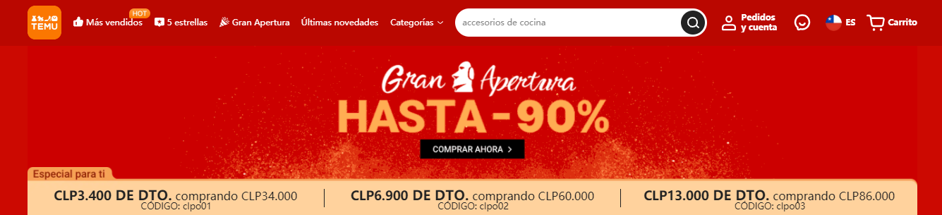 据亿邦动力报道,当你登录穆特智利站的页面时,你会发现该平台在首页显眼的地方提供大额优惠活动和免费送货服务。折扣幅度较大,如“半年折扣”,标注为“原价直减90%”,还有受众低于1999智利比索的低价专区。此外,平台还为特定品类提供了很大的推广力度,如“家居年轻化减85%”、“电子领域史诗报价减90%”。