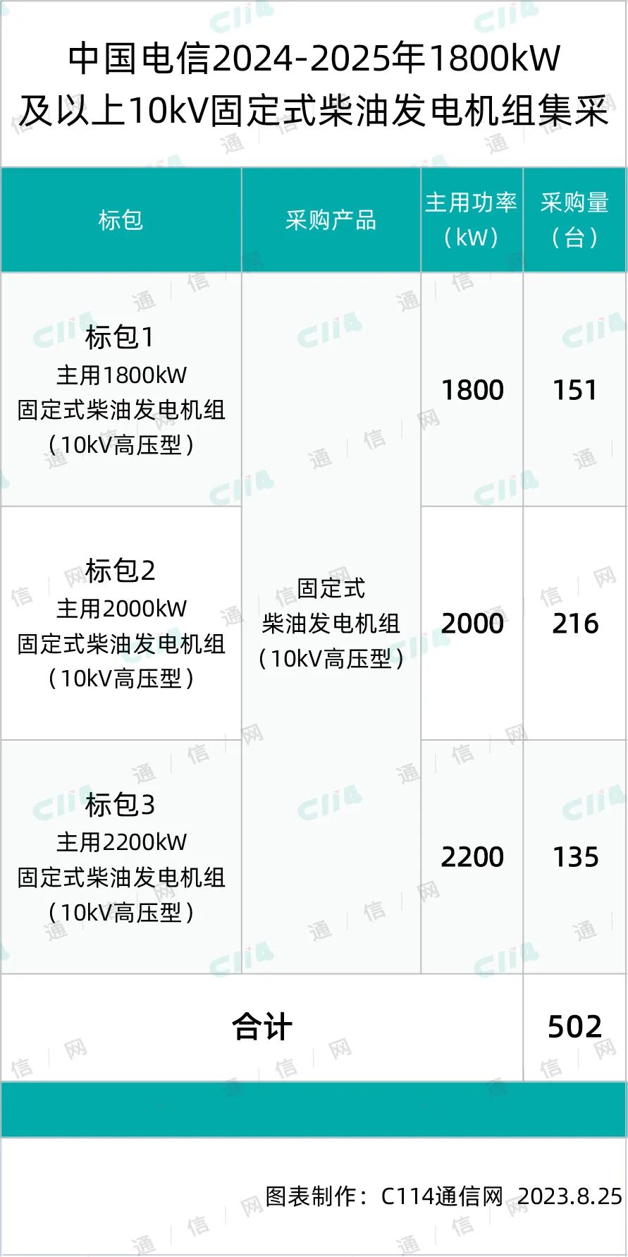 根据公告,本项目采购内容为中国电信集团有限公司、中国电信股份有限公司及其下属子公司、分支机构两年内所需的1800kW及以上10kV固定式柴油发电机组产品。总购买量为502套。