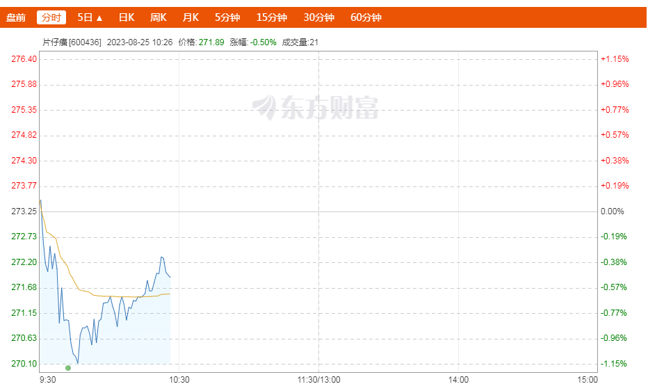 8月25日,截至记者发稿,片仔癀下跌0.5%,至271.89元/股,总市值1640亿元。