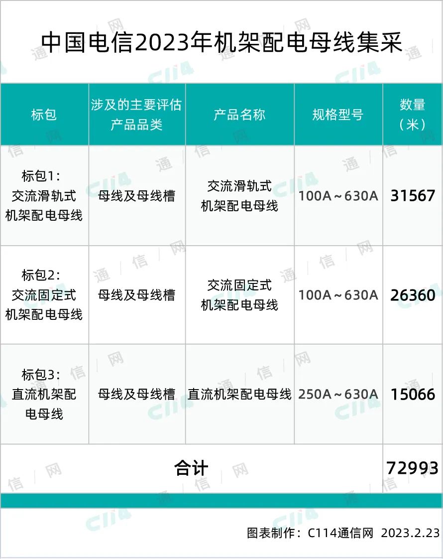 根据中国电信此前发布的集中采购公告,采购内容为中国电信集团有限公司、中国电信股份有限公司及其下属子公司、分支机构两年内所需的机架式配电母线产品,包括交流滑轨机架式配电母线、交流固定机架式配电母线和DC(滑轨/固定)机架式配电母线。总采购规模为72993米。该项目分为三个标准包。